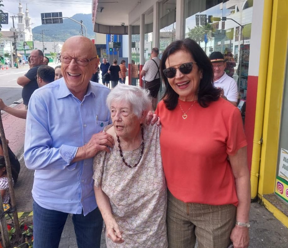 A dona Ivone Taranto, firme e forte aos 88 anos, brilhou no desfile da Schützenfest e ainda ganhou um abraço carinhoso do senador Esperidião Amin e da esposa dele, Angela. Um momento cheio de carinho e respeito que emocionou todo mundo por perto.