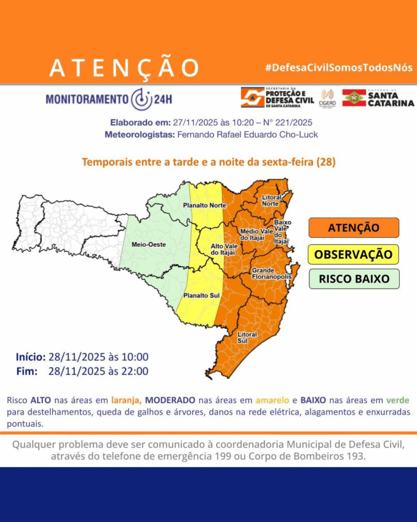 Segundo a Defesa Civil, a combinação desses fatores pode gerar chuva intensa, raios, granizo e rajadas de vento em áreas do Planalto, Vale do Itajaí e Litoral. O risco é considerado moderado a alto para destelhamentos, danos à rede elétrica, queda de galhos e árvores, além de alagamentos pontuais.