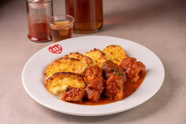 Cubos de carne suína flambada com cachaça ao molho de páprica doce, mostarda e cebola, servidos com delicioso nhoque à la romana, assado no forno, macio por dentro e crocante por fora.