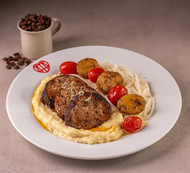 Suculentos escalopes de mignon suíno, envoltos em uma crosta irresistível com toque de café e temperos selecionados, servidos sobre purê de aipim, espaguete de palmito e batatas sauté.