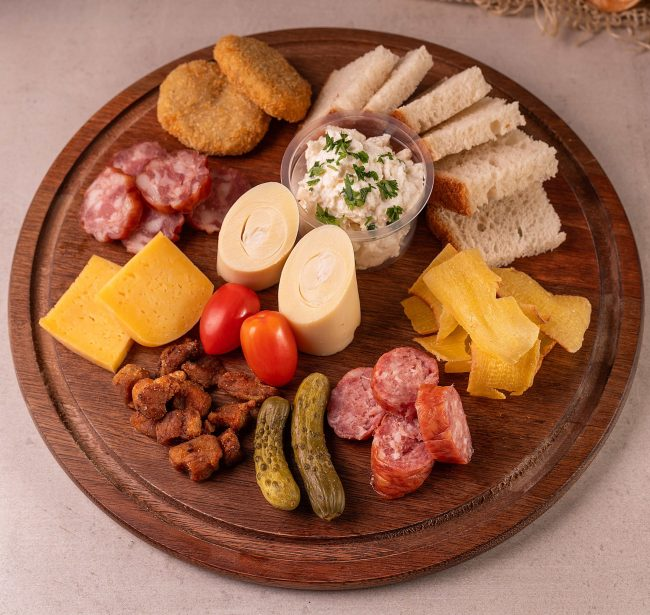 Tábua de aperitivos que inclui: palmito e pepino em conserva, linguiça Blumenau, salame, torresmo crocante, queijo colonial, Schnitzel, chips de aipim e pão caseiro de aipim com patê de palmito artesanal.