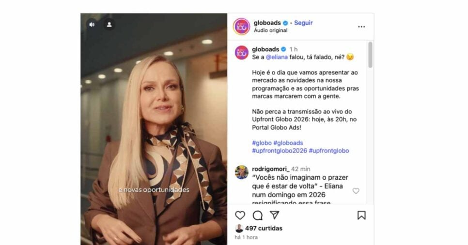 Nesta segunda-feira, 13, a Rede Globo fez um grande anúncio envolvendo o futuro de Eliana: a partir de 2026, ela ganhará o seu programa nas tardes de domingo. Porém, até o momento, não há detalhes sobre o novo programa. A divulgação acontecerá no Upfront 2026, evento em que a Globo apresenta as novidades da programação. “E por falar em audiência, eu tenho um super spoiler. O meu programa novo está chegando aí na tela dos domingos na Globo para nossa alegria. Nos veremos todo final de semana, eu estou tão ansiosa e tão feliz”, disse Eliana em vídeo. De acordo com informações do portal F5, da Folha de S.Paulo, a atração deverá ser em um formato estrangeiro, como era o The Masked Singer Brasil. Além disso, é possível que o novo programa ocupe o horário que foi do The Masked Singer Brasil, cancelado pela emissora carioca após cinco temporadas.