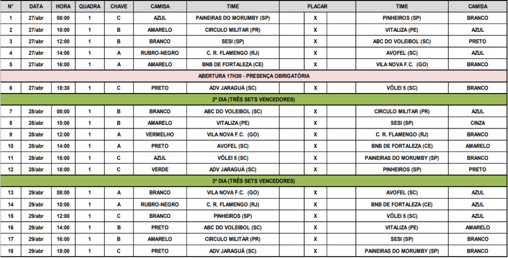 Anfitriã, a ADV/Jaraguá/Secel integra a Chave C e estreia às 18h30 de hoje, contra o Vôlei 5, de Florianópolis. Na terça (28), enfrenta o Pinheiros (SP), às 18h, e fecha a participação no grupo na quarta-feira (29), quando encara o Paineiras do Morumby (SP), às 18h.