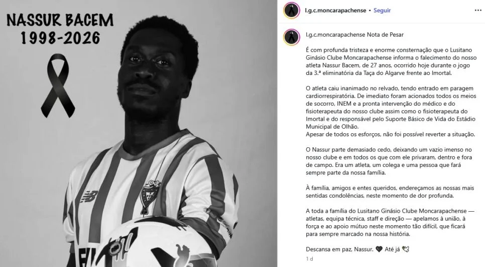 Famoso jogador de futebol sofre mal súbito no meio da partida e morre de forma precoce aos 27 anos. Apesar de fazer parte do processo natural da vida, a perda do atleta no seu auge causa comoção. Trata-se do lateral Nassur Bacem, do Moncarapachense, que veio a óbito na última quarta-feira, 21 de janeiro, após sofrer um mal súbito durante o jogo contra o Imortal. A partida é válida pelas quartas de final da Taça da Associação de Futebol do Algarve, em Portugal. O anúncio da morte veio à tona horas depois do ocorrido, através de uma nota oficial divulgada pelo Moncarapachense. “É com profunda tristeza e enorme consternação que o Lusitano Ginásio Clube Moncarapachense informa o falecimento do nosso atleta Nassur Bacem, de 27 anos, ocorrido hoje durante o jogo da 3.ª eliminatória da Taça do Algarve frente ao Imortal”, diz a nota.