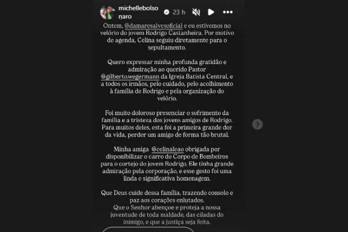 “Foi muito doloroso presenciar o sofrimento da família e a tristeza dos jovens amigos de Rodrigo. Para muitos deles, esta foi a primeira grande dor da vida, perder um amigo de forma tão brutal”, destacou a madrasta de Flávio Bolsonaro. Também estiveram presentes no enterro a senadora Damares Alves (Republicanos-DF) e a vice-governadora Celina Leão (PP). Michelle ainda fez um agradecimento ao pastor Gilberto Wegermann por ter organizado a despedida do adolescente.