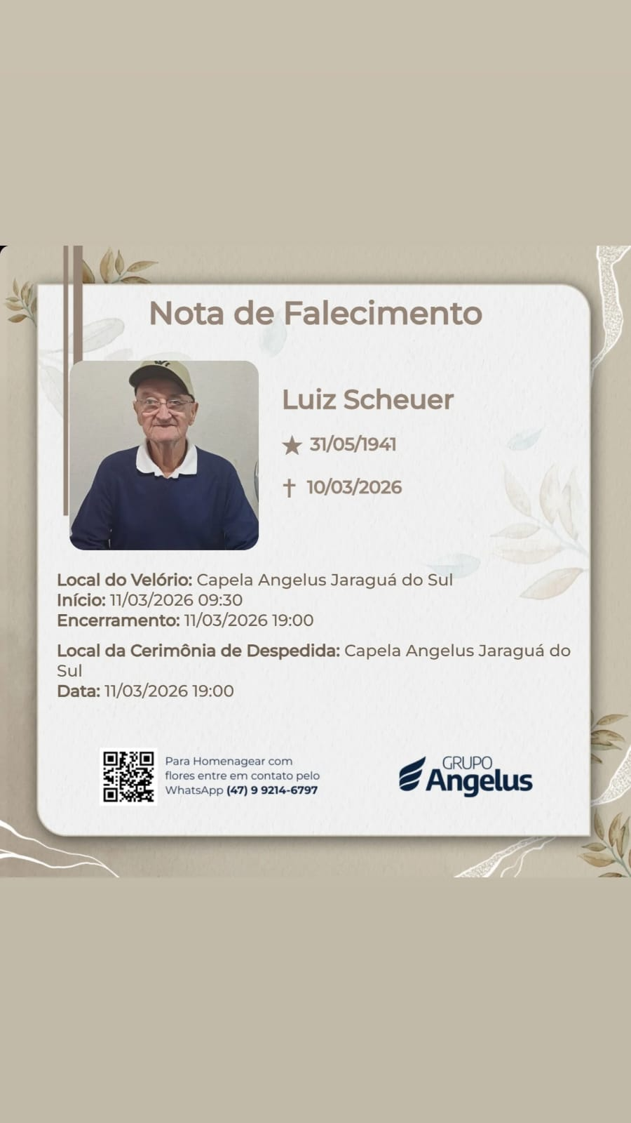 Faleceu nesta terça-feira (data), em Jaraguá do Sul, aos 84 anos, Luiz Scheuer, ex-funcionário do Banco do Brasil. Luiz não resistiu às complicações após uma cirurgia de apendicite realizada no Hospital São José, na cidade. Ele era pai do jornalista e apresentador da Globo, Thiago Scheuer, além de Débora e Cláudio Scheuer. Familiares, amigos e ex-colegas de trabalho lamentam profundamente sua partida e prestam homenagens nas redes sociais, lembrando sua trajetória e convivência.
