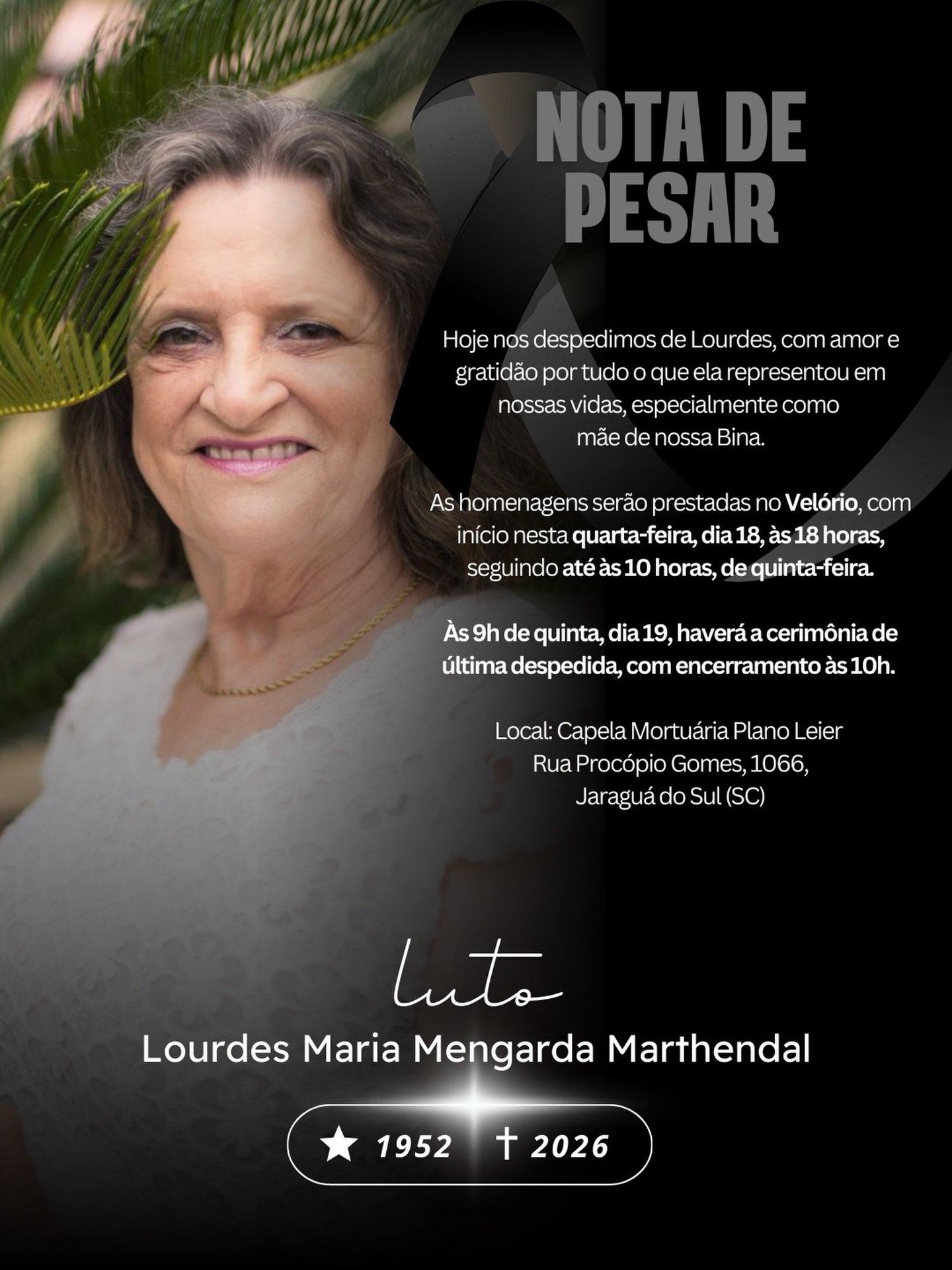 Faleceu nesta última quarta-feira, 18 de fevereiro de 2026, aos 73 anos, a contadora Lourdes Maria Mengarda Marthendal. Ela deixa enlutados o esposo, filhos, genro, nora, neto, irmãos, cunhados, demais familiares e amigos. O velório ocorre na Capela Leier Centro. O sepultamento será realizado hoje, quinta-feira (19), às 10h, no Crematório Catarinense, em Jaraguá do Sul. Que as lembranças tragam conforto e força aos familiares e amigos neste momento de despedida.