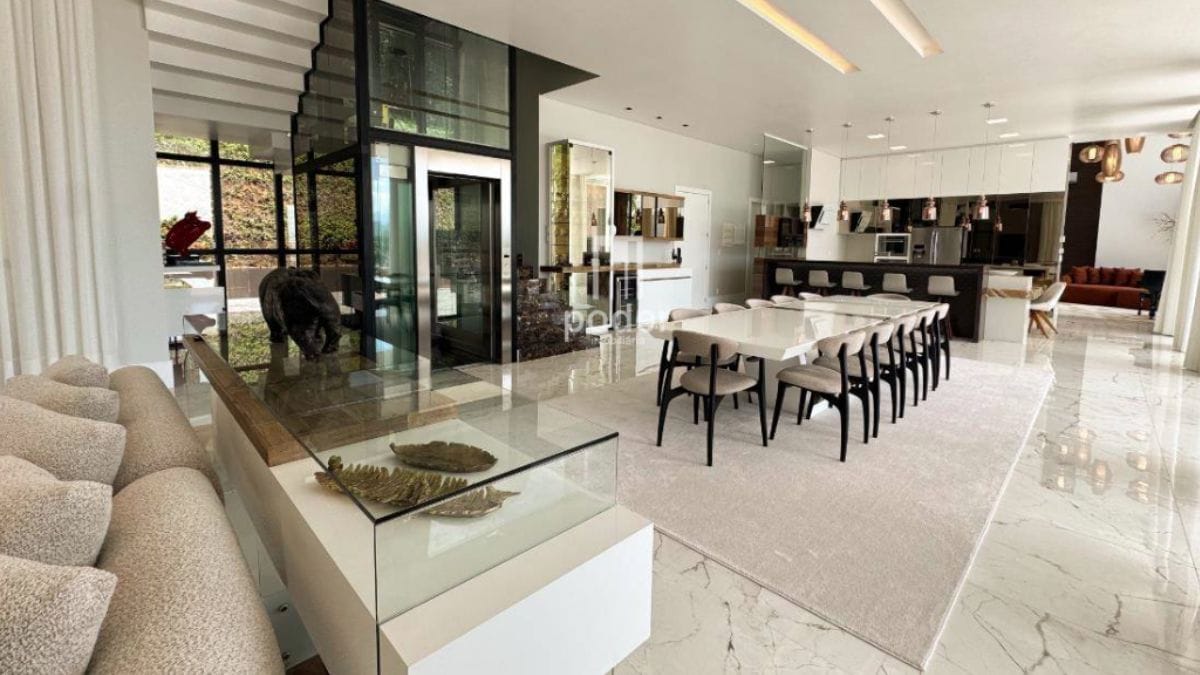 O imóvel oferece uma estrutura ampla e sofisticada. A casa conta com três suítes com sacada no piso superior e mais uma suíte no térreo. Totalmente mobiliada, a residência também se destaca pela vista privilegiada da cidade e pela área cercada de natureza, proporcionando tranquilidade e contato com o verde.